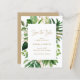Modern botanical themed budget save the date with your details inside of a geometric frame surrounded by watercolor painted tropical greenery and faux gold leaves. The backside is a matching gold tone. An elegant save the date that is great for a summer wedding.