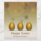 An abstract and modern Easter illustration featuring 3 golden Easter eggs on a bokeh background with abstract flowers.