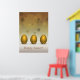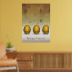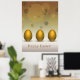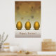 An abstract and modern Easter illustration featuring 3 golden Easter eggs on a bokeh background with abstract flowers.