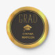 Modern Grad 2016 black and gold graduation paper plate showcasing the word “grad” and a graduation cap in gold and your text on a black circle with a golden border.