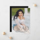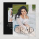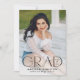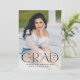 Announce your high school or college graduate's graduation with this modern graduation announcement. The graduation announcement displays "Grad" in trendy black lettering with the graduation year displayed inside of the letter 'd'. Personalise the front of the announcement with the graduate's vertical senior photo, name, and school. The announcement reverses to feature an additional photo displayed inside of a white square frame with your message shown below.