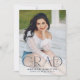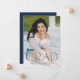 Announce your high school or college graduate's graduation with this modern graduation announcement. The graduation announcement displays "Grad" in trendy navy lettering with the graduation year displayed inside of the letter 'd'. Personalise the front of the announcement with the graduate's vertical senior photo, name, and school. The announcement reverses to feature an additional photo displayed inside of a white square frame with your message shown below.
