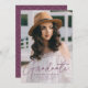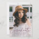 Celebrate the grad with our stylish vertical photo graduation announcement. The graduation announcement displays the graduate's vertical photo with "Graduate" in a purple modern calligraphy script overlay. Personalise the front of the modern graduation announcement by adding the graduate's name, school name, and graduation year. The announcement reverses to feature a trendy purple and white dotted geometric pattern. The design is perfect for both high school and college graduates.