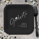 Modern Graduate Script White Cap Black Paper Plates. Stylish, personalised graduation party paper plates in your choice of colours featuring a modern handwritten script title GRADUATE accented with a white graduation cap with name, school and class year or your custom text (shown in white on black). Change the colour of the GRADUATE graphic, background and/or text colours in EDIT. PLATE OPTIONS: The sample is shown in the 7-inch square plate--other sizes and styles are available on the ordering page. ASSISTANCE: For help with design modification or personalisation, colour change, transferring the design to another product or if you would like coordinating items, contact the designer BEFORE ORDERING via the Zazzle Chat MESSAGE tab or email makeitaboutyoustore@gmail.com.