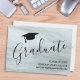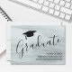 This modern and elegant graduation announcement card features stylish script typography with a grad cap on a grey background.
