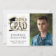 Announcement the graduation achievement of your son or daughter with this graduation announcement card featuring 2 photos of your graduate, a modern hand lettered brush calligraphy typography title design GRAD with class year and graduation cap or mortarboard in black and gold against an editable white background with name and school. The back offers a place to add your custom text about your graduate's achievements and plans. ASSISTANCE: For help with design modification/personalization, color change, transferring the design to another product or if you would like coordinating items, contact the designer BEFORE ORDERING via the Zazzle Chat MESSAGE tab or email at makeitaboutyoustore@gmail.com.