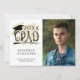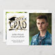 Announce the graduation achievement of your son or daughter with this 2 photo graduation announcement card featuring a modern hand lettered brush calligraphy typography title design GRAD with class year and graduation cap or mortarboard in editable colours (shown in black) against a gold swash. Change the text, graduation cap or background colours to school colours or to coordinate with your photos. The back offers a place to add your custom text about your graduate's achievements and plans. ASSISTANCE: For help with design modification/personalisation, colour change, transferring the design to another product or if you would like coordinating items, contact the designer BEFORE ORDERING via the Zazzle Chat MESSAGE tab or email at makeitaboutyoustore@gmail.com.