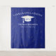 Modern graduation celebration blue backdrop for photo opportunities! Glitter at top and bottom, gold streamers from top edge, white graduation cap and lettering. Class of in gold glitter script lettering with template of year in blue. Add year, name and school name.