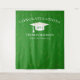 Modern graduation celebration green backdrop for photo opportunities! Glitter at top and bottom, gold streamers from top edge, white graduation cap and lettering in white. Class of in gold glitter script lettering with template of year in green. Add year, name and school name.