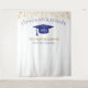 Modern graduation celebration backdrop for photo opportunities! Glitter at top and bottom, gold streamers from top edge, graduation cap and lettering in blue, name template in gold. Class of in gold glitter script lettering with template of year in white. Add year, name and school name.