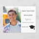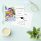 On front: Add your own vertical size photo of the graduate. A chic white background, black text. Templates for a name and date. The name is written with a modern hand lettered style script. With a cap, tassel topper.