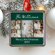 Modern emerald green Christmas ornament gift with chic handwritten scrawl of your last name above your family photo collage of your 5 favorite 2025 pictures. An elegant holiday present featuring one vertical photograph in the center and 4 square pictures on the sides with your custom message in white script.
