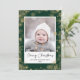 Send customisable and personalised holiday greetings to friends, colleagues and family in simple, minimalist, elegant, fun, festive and modern photo cards! A beautiful frame of variety of gold winter snowflakes on sage green background surrounds your photo. The greeting " Merry Christmas " is written in elegant calligraphy, and below features your custom greeting message from your family name in modern typography. Reverse to reveal a beautiful the full gold winter snowflakes on sage green pattern background.