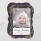 Modern Blue Elegant Script Snowflakes Bokeh Minimalist Holiday Card. Send customisable and personalised holiday greetings to friends, colleagues and family in simple, minimalist, elegant, fun, festive and modern photo cards! A beautiful frame of variety of gold winter snowflakes on sage green background surrounds your photo. The greeting " Merry Christmas " is written in elegant calligraphy, and below features your custom greeting message from your family name in modern typography. Reverse to reveal a beautiful the full gold winter snowflakes on sage green pattern background.