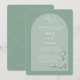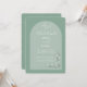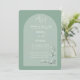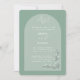 Modern Green Hues Arch Wedding Invitation. Blue hue shades with arch. Script and serif fonts. White flowers and white text. Back has lines of light blue. Modern and minimalistic design. Personalise with your wedding details.