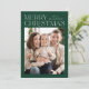 Modern Christmas photo card featuring "Merry Christmas" displayed at the top of the design in trendy white lettering with a green background. Personalise the simple Christmas card with your family name and photo. The card reverses to display a green background with subtle white dots (snow).
