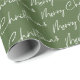 Modern christmas wrapping paper featuring a green background with the seasons greetings "merry christmas" scattered across it.