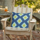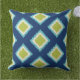 Stylish and chic square outdoor accent pillow design features a diamond Ikat style pattern in apple yellow / green, aqua / turquoise blue, soft white, and navy blue (background can be customised) colours.