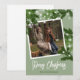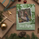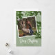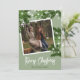 Festive greenery christmas card featuring a green background, a photo for you to replace with your own, christmas pine tree foliage, string lights, the seasons greetings 'merry christmas', and your family name.
