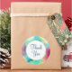 Thank you stickers with a cool and stylish abstract design. Watercolors mix and mingle to create the illusion of a space image. Green with swirls of purple, yellow and light red blend together with a smattering of white dots and stars. An elegant artistic creation. A white circle layered over top with your text inside.