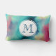 A pillow with a cool and stylish abstract design. Watercolors mix and mingle to create the illusion of a space image. Green with swirls of purple, yellow and light red blend together with a smattering of white dots and stars. An elegant artistic creation. A circle layered over top with your monogram initial inside.