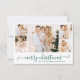 Elegant Calligraphy Script 5 Photo Collage Christmas Cards. This festive, minimalist, five (5) photo holiday greeting card features a nice grid photo collage and says „Merry Christmas”! The „Merry Christmas” greeting text is written in a beautiful hand lettered swirly swash-tail font type green and white. On the reverse side hand drawn pine tree doodle pattern. Pretty greeting card for your family and friends in Winter Holiday season.