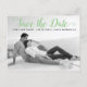 Modern light green script wedding Save the Date photo postcard. This contemporary typography Save the Date design features a black and white photo of the couple and the text "Save the Date" in a modern script font.