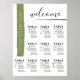 Simple, modern wedding seating chart with a green brush stroke down the left side and welcome at the top. Easy to read and customise. Room to add at least two more guests to each table. Very economical way to show your guests to the right seat. Could be mounted on foam core board and placed on an easel. This poster matches other pieces in this wedding suite.