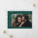 Share the news of your surprise engagement with these elegant photo engagement announcements. The design features the phrase "Surprise, we got engaged!" in a trendy white script and modern lettering on a dark green background. Your engagement photo is featured in the centre-right part of the design with your names and engagement date displayed on the left. Personalise the surprise engagement announcement by adding additional details below such as wedding city/state, wedding website, etc. The announcement reverses to display a dark green foliage pattern on a white background.