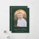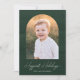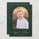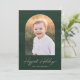 Trendy and modern holiday photo card featuring your favorite image inside of an arch frame with a rich hunter green watercolor background. “Happiest Holidays” is displayed in a white, handwritten script font with your family’s name shown below. The back of the chic holiday card continues the look with a coordinating hunter green watercolor brushstroke design.