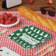Host a festive holiday party with paper plates featuring a white geometric tree pattern on a green background. In a white rectangle across the centre, it reads, "Merry Christmas" in a green script font above your name in a simple green font. Personalise it by adding a custom greeting, family name and/or the year in the sidebar.