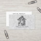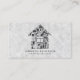 Modern trendy grey business card designed for a commercial or residential services for cleaning, housekeeper, maid service, or janitorial supplies. Design featuring of grey house icon and cleaning equipment icons inside it. Customise the front with two lines of custom text on a black background, and add your full contact details to the back and social media details. Trendy chic modern design.