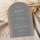 This elegant arch-shaped modern wedding invitation features peach faux glitter side borders. The customisable text combines white handwriting, copperplate and italic fonts on a grey background. The reverse side features a matching grey and peach glitter design.