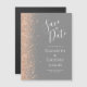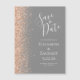 The left-hand edge of this elegant modern wedding save the date magnetic card features a peach faux glitter border. The customisable text combines white handwriting, copperplate and italic fonts on a grey background.