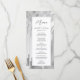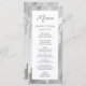 This elegant, modern wedding menu features a watercolor grey agate background trimmed with silver faux glitter. The text appears in elegant charcoal grey handwriting and sans serif fonts on a white rectangle. The agate design is repeated on the reverse.