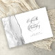 This elegant wedding guest book features a grey and white watercolor agate design trimmed with faux silver glitter. Easily customise the charcoal grey text on a white background, with the names of the bride and groom in whimsical handwriting calligraphy over a large ampersand. Add additional text of your choice to the front and spine.