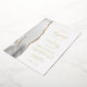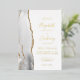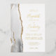 The left-hand edge of this elegant modern wedding invitation features a grey and white watercolor agate border trimmed with faux gold glitter. The customisable text combines handwriting, copperplate and italic fonts in real gold foil on a white background. The reverse side features a matching grey, white and gold agate design.