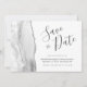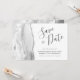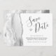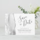 This elegant modern save the date card features a grey and white watercolor agate border trimmed with faux silver glitter. The customisable text combines handwriting script, copperplate and italic fonts in charcoal grey on a white background. The reverse side features a matching grey, white and silver agate design.