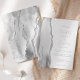 The left-hand edge of this elegant modern wedding invitation features a grey and white watercolor agate border trimmed with faux silver glitter. The customisable text combines handwriting, copperplate and italic fonts in real silver foil on a white background. The reverse side features a matching grey, white and silver agate design.