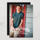 A simple and modern design that features your graduate's photo on the front with all the party or announcement details on the back. Vertical format in with a trendy, retro typography design that has a young masculine feel. A casual announcement that highlights your son's graduation celebration.