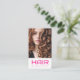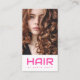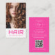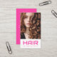 Modern business cards featuring custom text "hair" in a modern font on a hot pink background with a photo of a girl with lovely curls above.