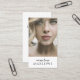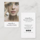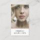 An artistic bold, modern minimal photo business card suitable for a hair & makeup artist. Replace this sample photo with your own creative photo. Serif name and handwritten script title. Your contact information and social media handle on the back.