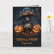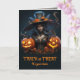 The front of this Halloween greeting card features a modern witch with a big hat and glowing eyes. Beside her are two grinning Jack o 'Lanterns. The inside of the card has text fields for your personal message, plus dead trees, a black raven, and a flying bat. All the text may be easily customised, so make it say whatever you'd like, or leave it as is...the choice is yours! Appropriate for adults.