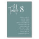 Simple and chic table number cards in dusty teal and white make an elegant statement at your wedding or event. Design features "table [number]" in handwritten script lettering, with individual guest names below in timeless serif typography. Design repeats on both sides.
