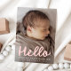 Welcome your baby girl with this charming photo birth announcement featuring her vertical photo and “Hello” in soft pink handwritten script. Below, her name and birth details appear in clean white text. The back displays a matching pink background with a 4-photo collage and space for a custom message—perfect for sharing your joy with loved ones.