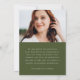 Announce your graduate's achievements and plans with this stylish, modern photo graduation announcement. The front of the announcement displays the graduate's full-bleed vertical photo. "Graduate" is displayed in a trendy, handwritten olive green script. Personalise the announcement with the graduation year, graduate's name, and school name. The announcement reverses to display an additional photo with your custom text below in white lettering with a solid olive green background. This 2 photo graduation announcement is perfect for high school or college graduations.