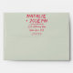 A retro-modern hand written bright colourful wedding envelope. Which features a bold bride and groom's names in handwritten red magenta colour. And personalised return address. On a simple sage green vintage colour background. Which suits the whole wedding suite.