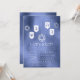 Modern Hanukkah party invitation with white hanging dreidels and Star of Davids on a blue bokeh background.