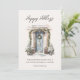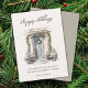 Modern script "Happy Holidays" watercolor front door decorated in holiday greenery image and extra space in the back for personal message flat holiday card.