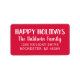 "Happy Holidays" return address labels feature white custom text that can be personalised with a return address and a festive red background.
